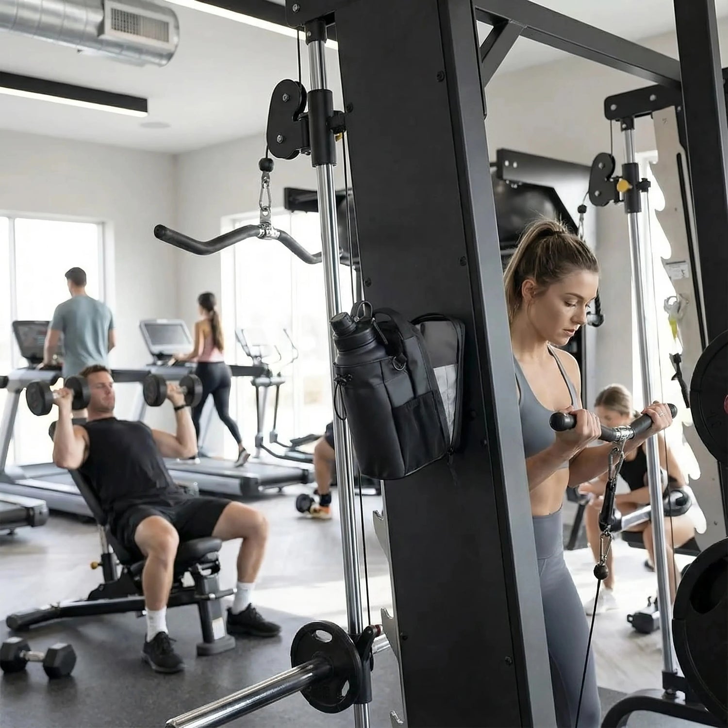 このバッグはジムの器具に固定できて、水筒を安全に持ち運び、必要なアイテムも収納できます。快適さ、邪魔にならない、結果を出そう! -